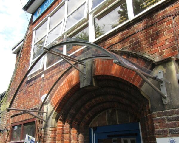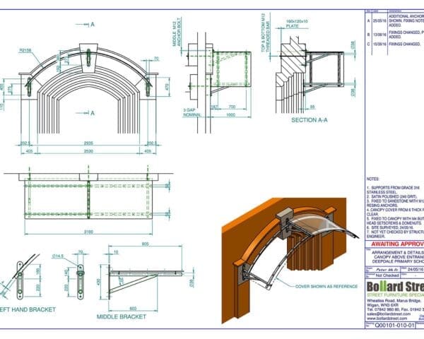 The supply and installation of a bespoke stainless steel canopy fitted above the main school entrance façade. Bollard Street Ltd successfully bid and secured the sub contract order to supply and install the bespoke canopy to be fixed to the existing ‘key stones’ on the building main entrance. After submitting detailed drawings and a 3D model for the proposed canopy structure after a full site survey, the canopy was manufactured and bolted to the existing sandstone keystones with suitable stainless steel fixings. The ‘gallows bracket’ design was manufactured in 316 grade stainless steel to exacting tolerances manufactured from precision laser cut profiles and covered with PETG glazing. Finally structural calculations where submitted to the client and contractor to prove compliance of all required loadings.