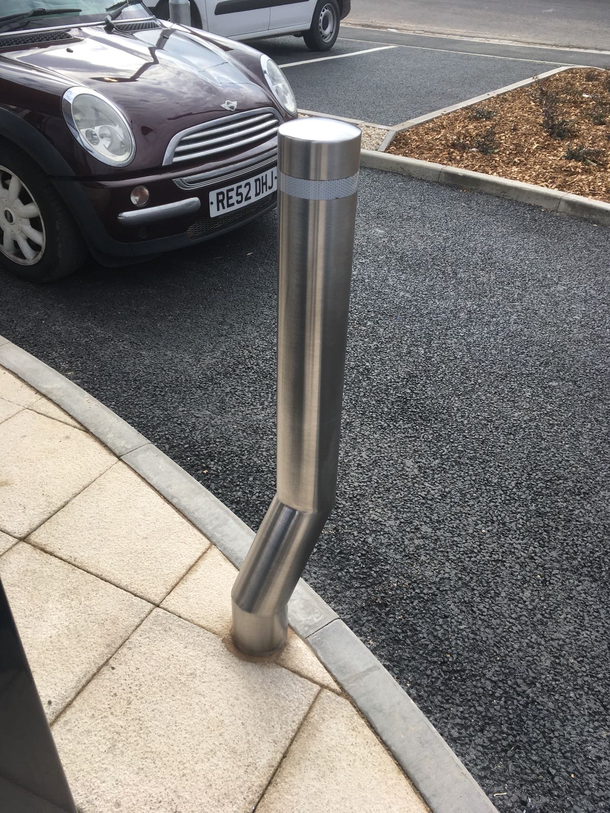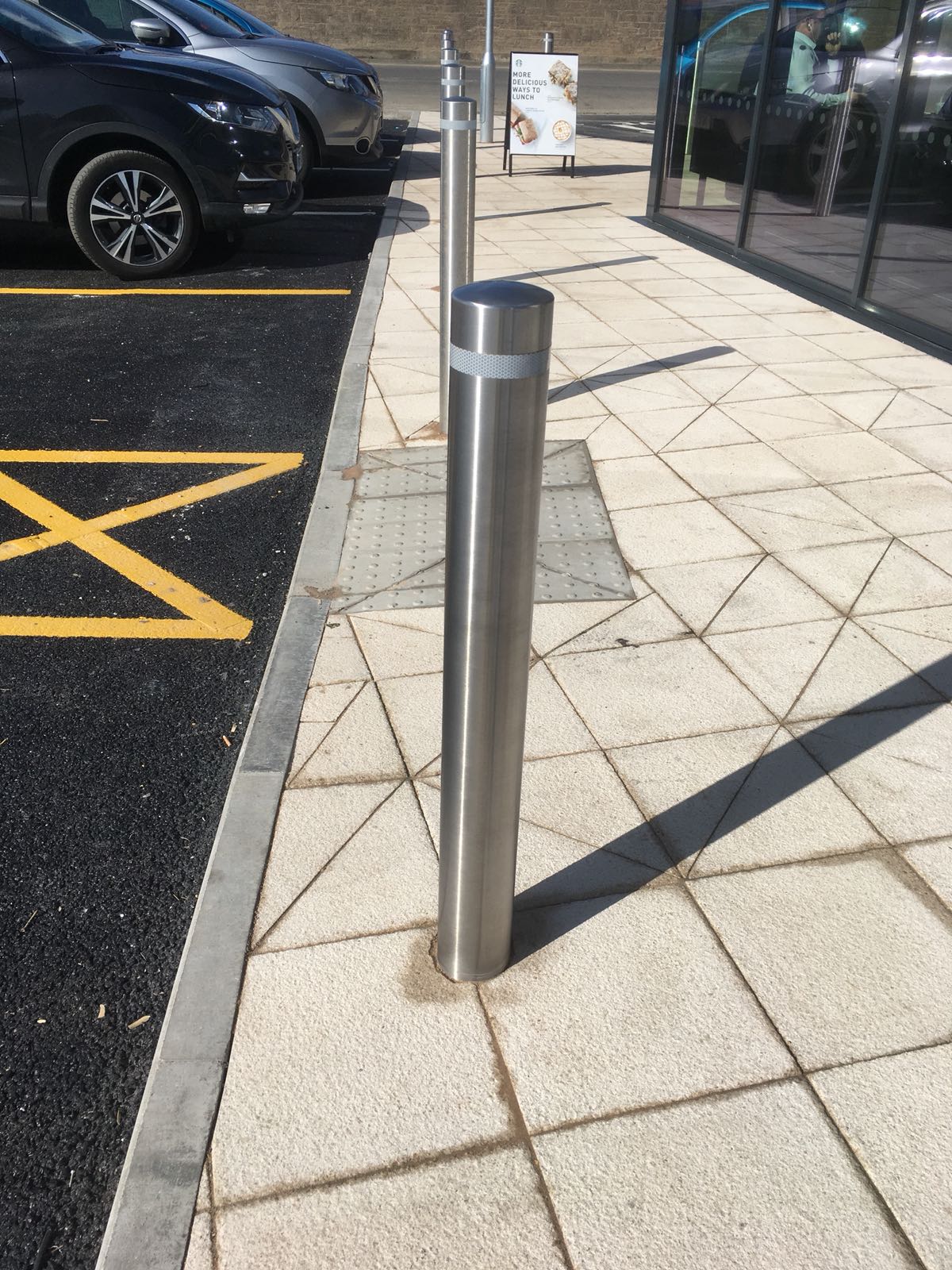 101 mm diameter stainless steel statics bollards with high visibility banding, and Sheffield cycle stands, and cranked bollards.