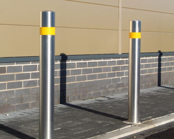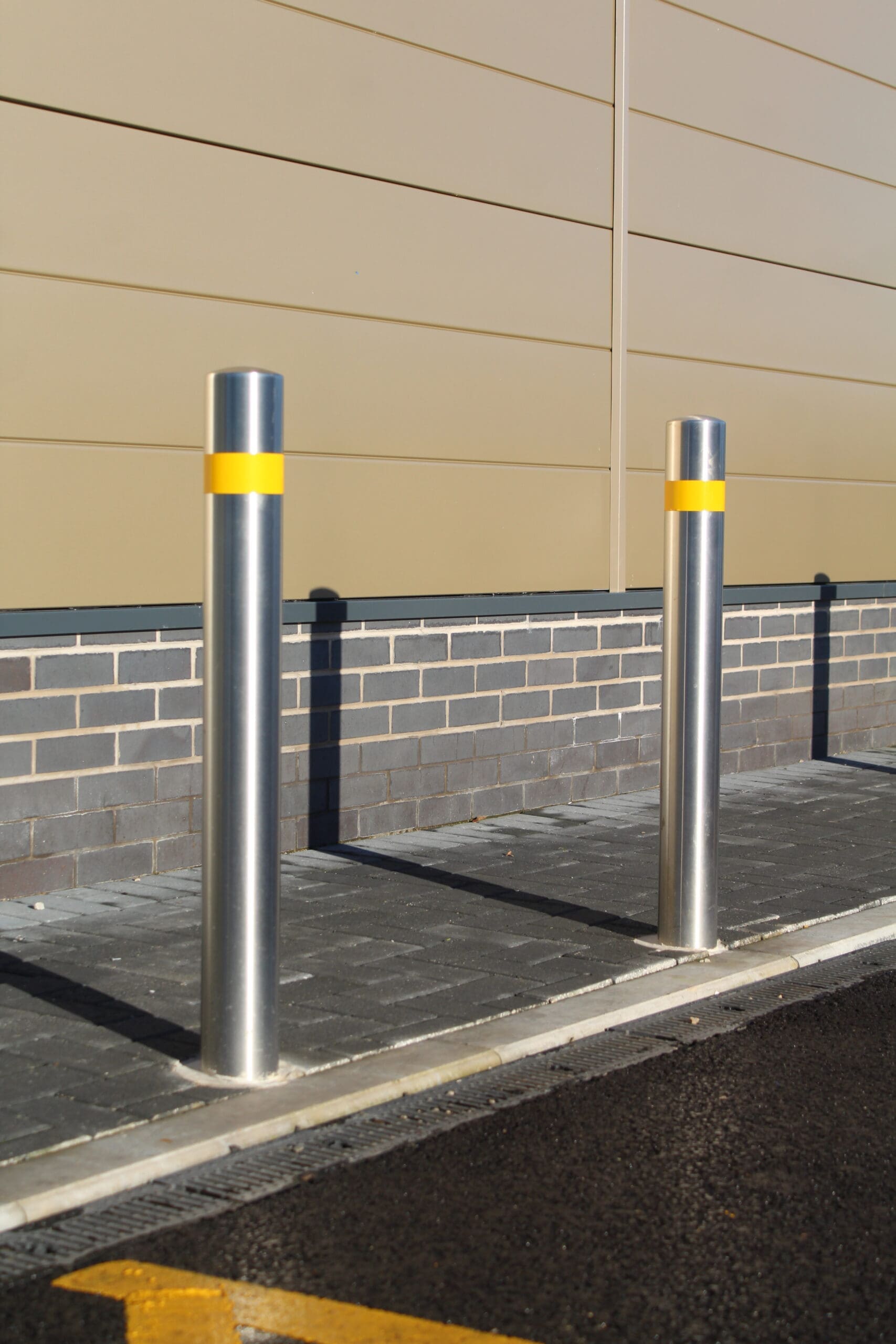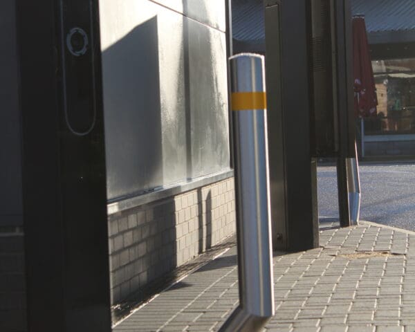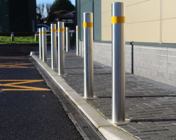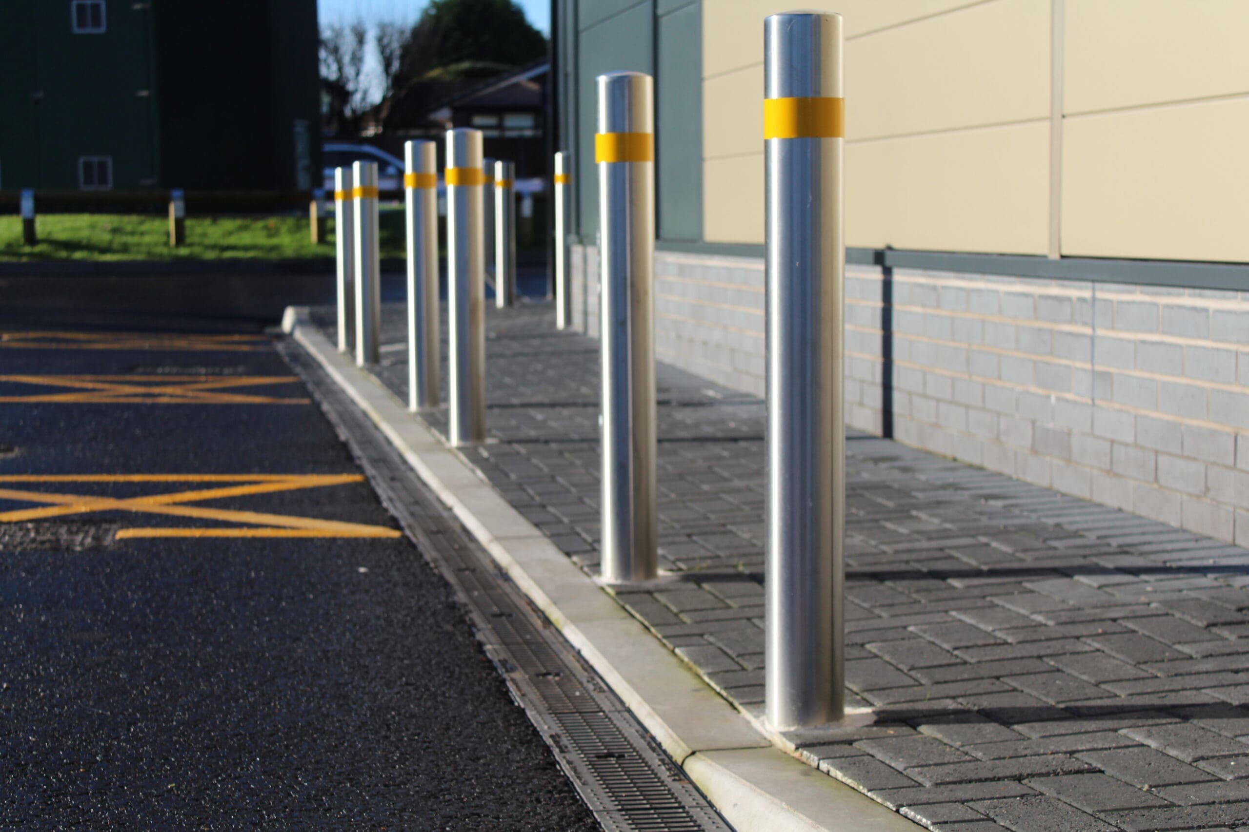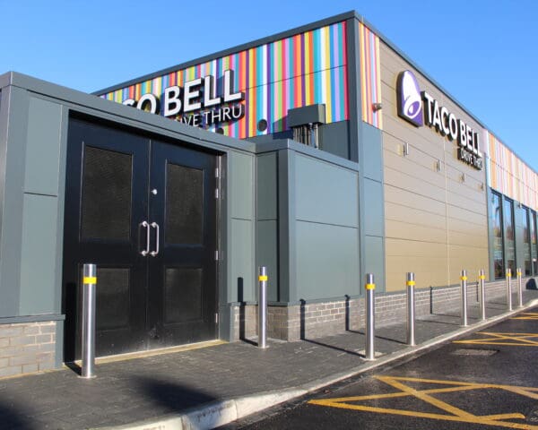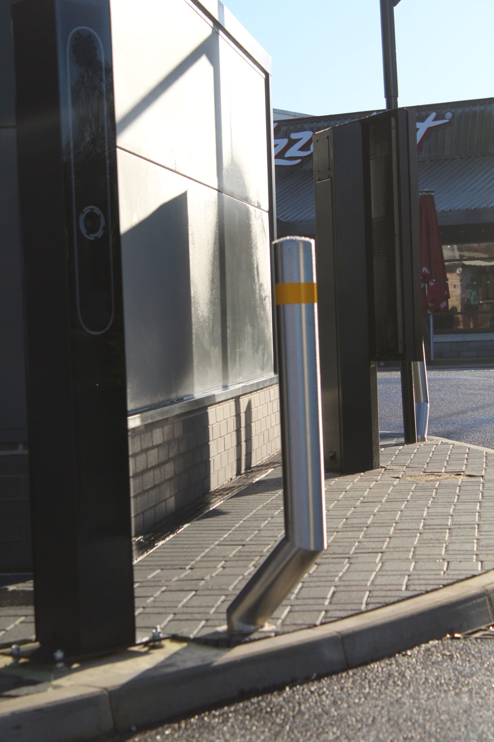 Bollard Street were contacted by the contractor to supply the bollards for the site. The Architect had opted for stainless steel bollards as they are sleek, sturdy, reliable, and they’re built to withstand extreme impact providing safety for pedestrians and building structures from moving vehicles. The requirement was for classic straight bollards around the perimeter of the building with cranked bollards serving as protection to the order points and hatches in the drive-thou area. All supplied with yellow reflective banding. There was also a requirement for cycle stands to allow staff and customers alike to secure their cycles but in keeping with the rest of the street furniture.