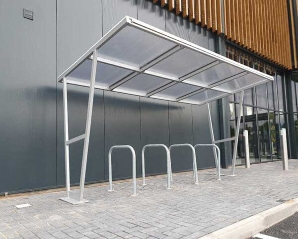 Tamworth design cycle shelter in silver RAL9006 with 16 mm twin wall polycarbonate roof system.