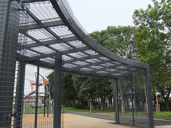 This striking bespoke curved shelter was specifically designed for public use in municipal areas, featuring off set 75 mm x 25 mm x 3 mm external mesh cladding cages designed to support most climbing plant species such as ivy and Virginia creeper.